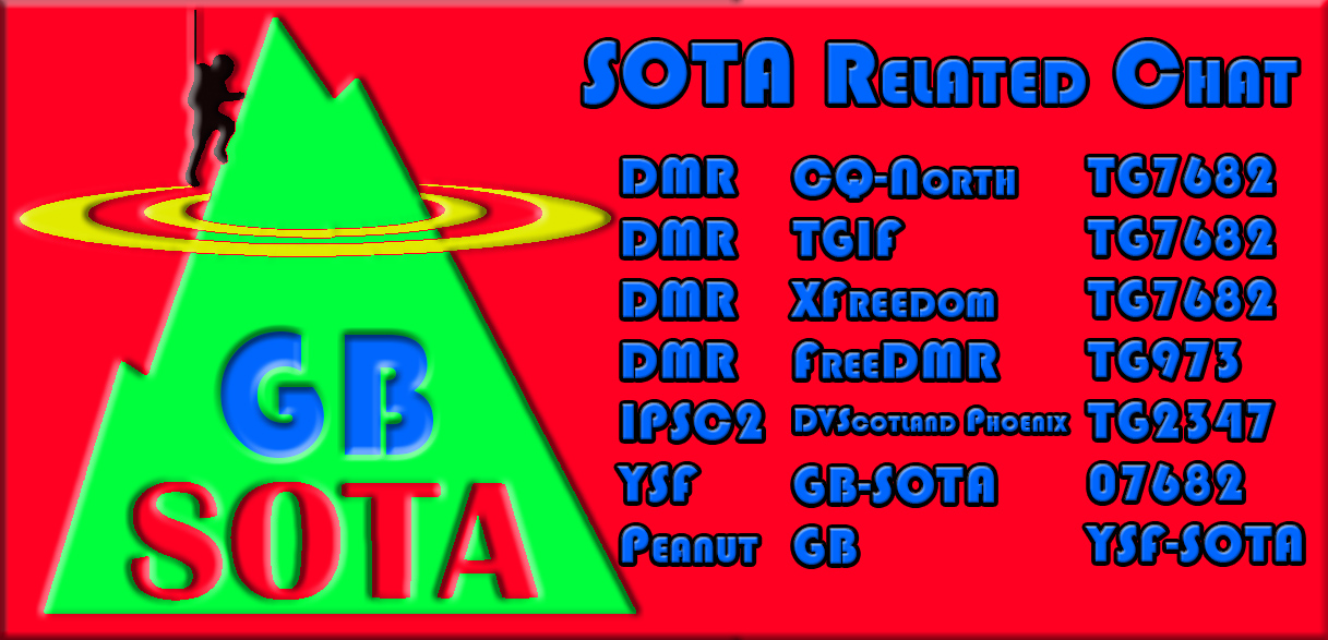 Welcome to the official website of GB-SOTAGB-SOTA is a digital multi-platform space where people that are interested in SOTA (Summits On The Air) can come together and talk about SOTA related activities etc. There are lots of interesting and helpful ideas planned on GB-SOTA, our aim is to promote and support SOTA and getting "out and about". We are sure that you will want to take part, get involved and chat with other SOTA friends. Please feel free to spread the word about GB-SOTA to all your friends. The “SOTA Net”Last Friday of every month at 19:30 UK Time Come together to meet with of SOTA operators and aspiring SOTA operators to discuss a variety of topics. We’ve got a wide variety of topics planned to suit all tastes including radio equipment, outdoor gear, best spots to SOTA and how to get more people involved in SOTA. We’ve arranged experienced net controllers to bring a great feel to the net and it will be a time to kick back, relax and enjoy yourself. See you at the “SOTA Net” Ways to connect to GB-SOTA via the following methods